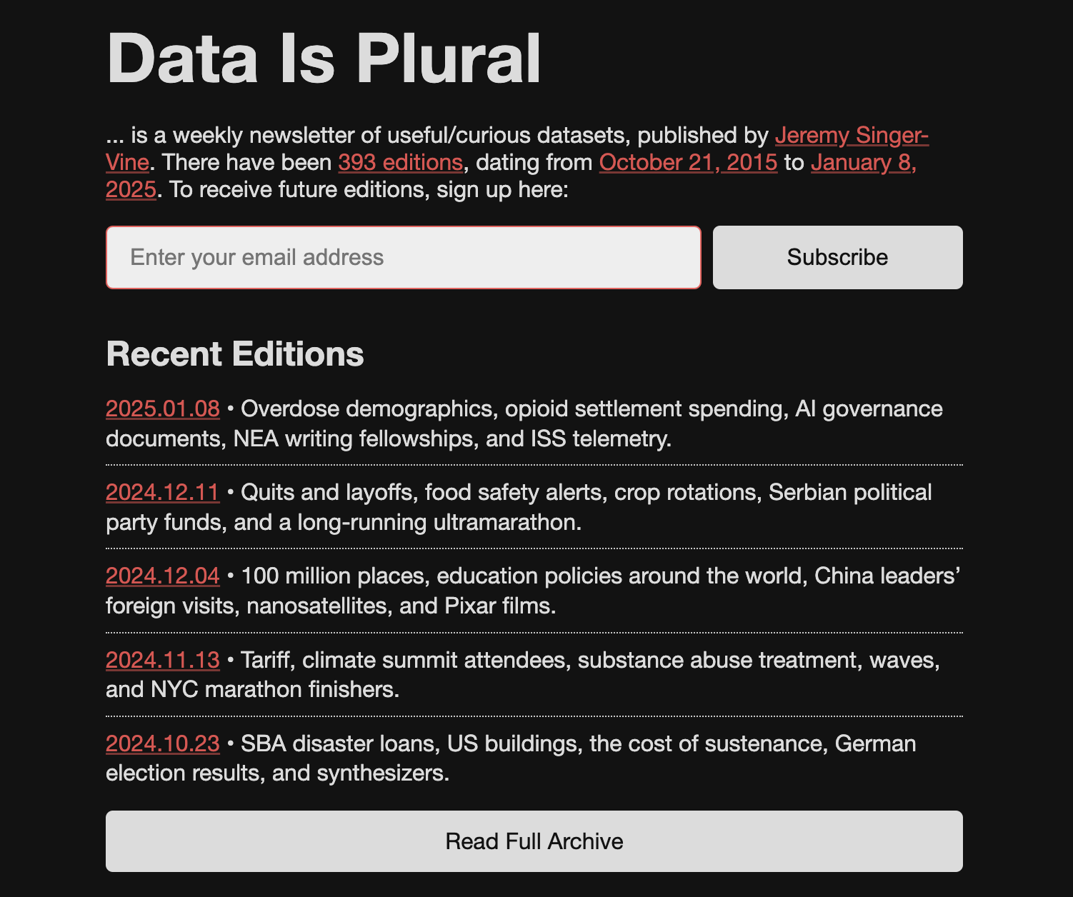 Since 2015, Jeremy Singer-Vine has published Data Is Plural, which he describes as “a weekly newsletter of useful/curious datasets.” He has archived every newsletter, each of which which contains multiple datasets, for a total of 1,965 datasets so far—a number I can only tell you because he has published a dataset about his dataset, which is to say, a metadata-set. Thanks, Jeremy!