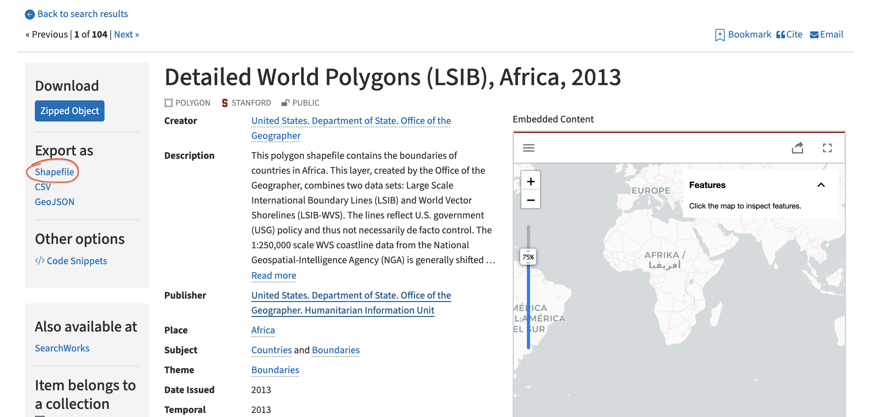 There are lots of places where you could download spatial data of African countries. For this activity, we’ll use Stanford University’s EarthWorks portal, a massive discovery tool for geospatial data. (Alternatives include the Tufts GeoData portal, Harvard’s Dataverse, Princeton’s Maps & Geospatial Data Portal, and the Big Ten Academic Alliance’s Geoportal.)