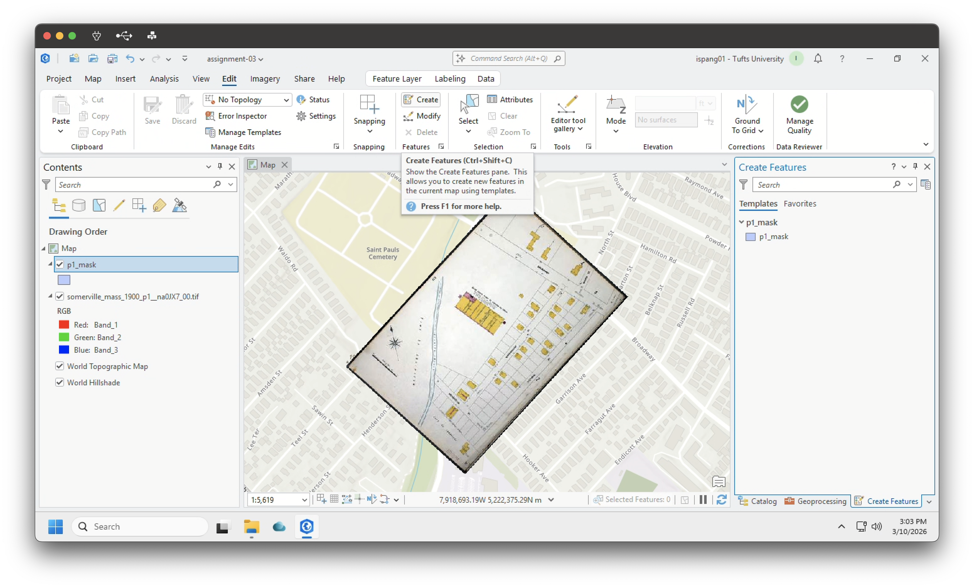 - Once it’s selected, you’re in “editing” mode and you can actually draw a polygon straight onto the map. You want to draw a mask that excludes the black edges of the georeferenced map without removing any important features. Watch the gif below for an example. Some notes: