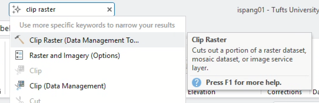 - Now, let’s clip that georeferenced map to the new vector mask. Search “clip raster” in the Command search bar—you should see an option for “Clip Raster (Data Management Tools)”. Go ahead and select that tool