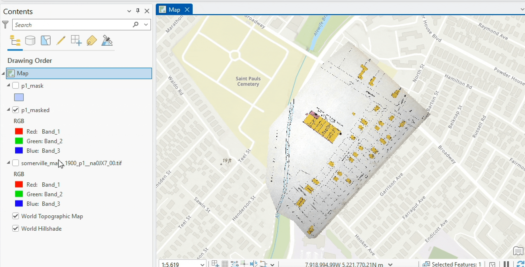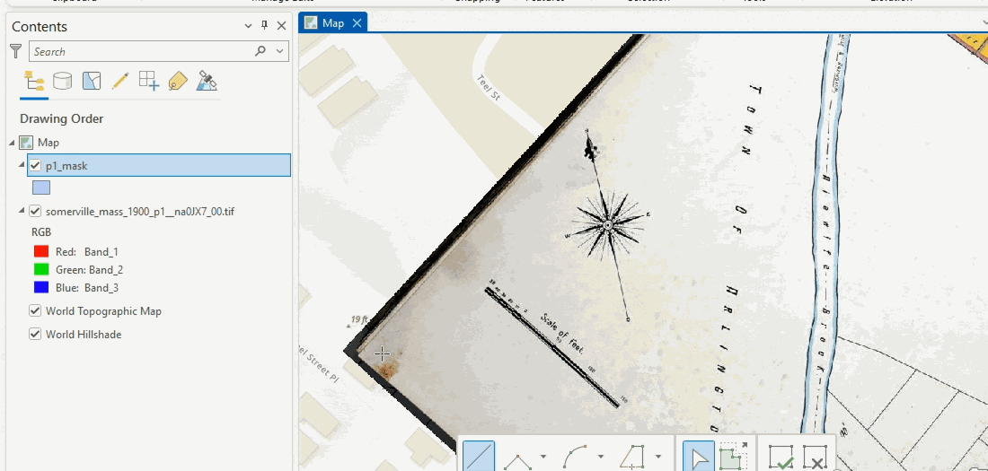 Masking refers to the process of cropping away unwanted or non-cartographic features in the map. We accomplish this in ArcGIS Pro by creating a vector layer “mask,” and then clipping the georeferenced map to it.