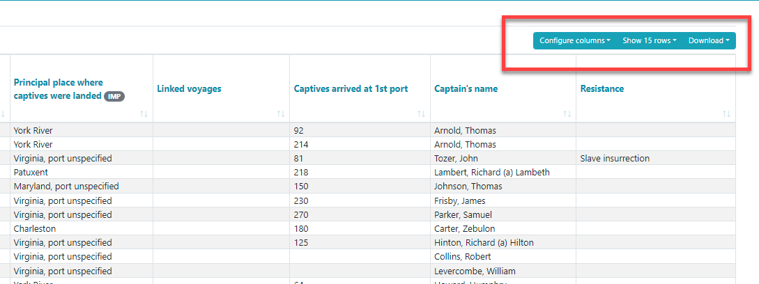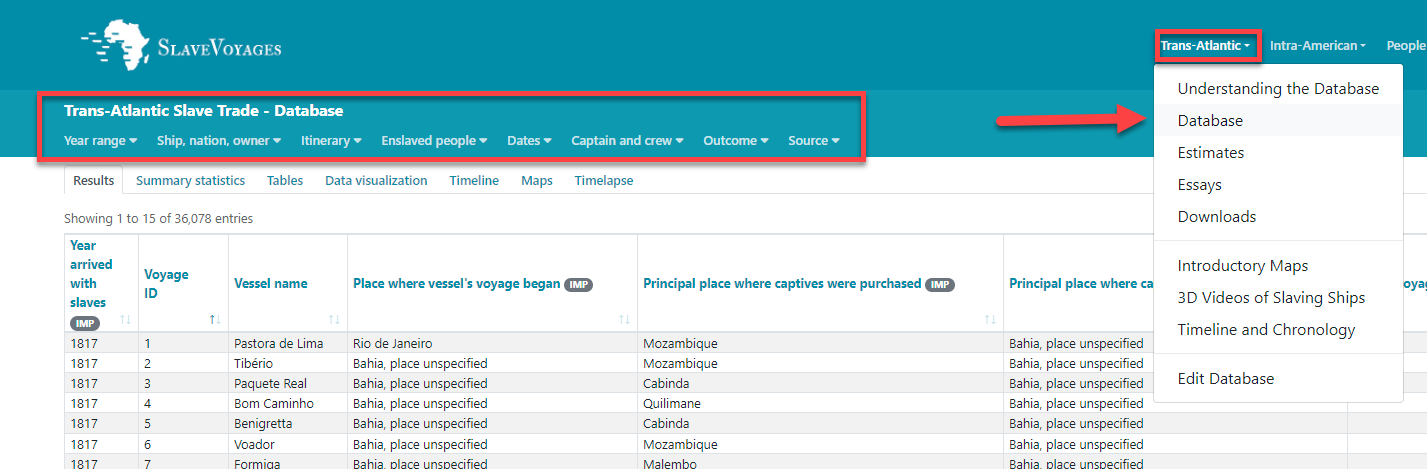 Go back up to the top drop down and under Trans-Atlantic, select Database. You will now see a database that has over 36,000 records (e.g., voyages). Notice how on the blue bar you can filter the data by fields such as year range, ship, itinerary, enslaved people, dates and more.