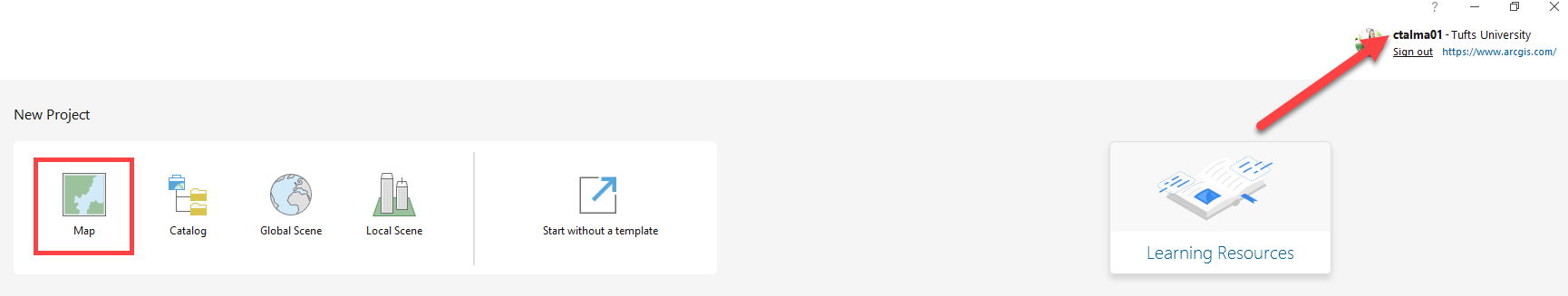 Login. Now you should see your username at the top right of ArcGIS Pro, as shown below.