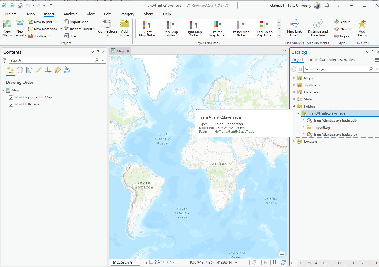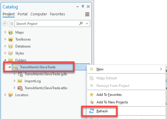 Go back to your ArcGIS Pro project and on the right side in Catalog, right click on your home folder “TransAtlanticSlaveTrade” and press Refresh. This will allow us to see any new files or folders added to this folder.