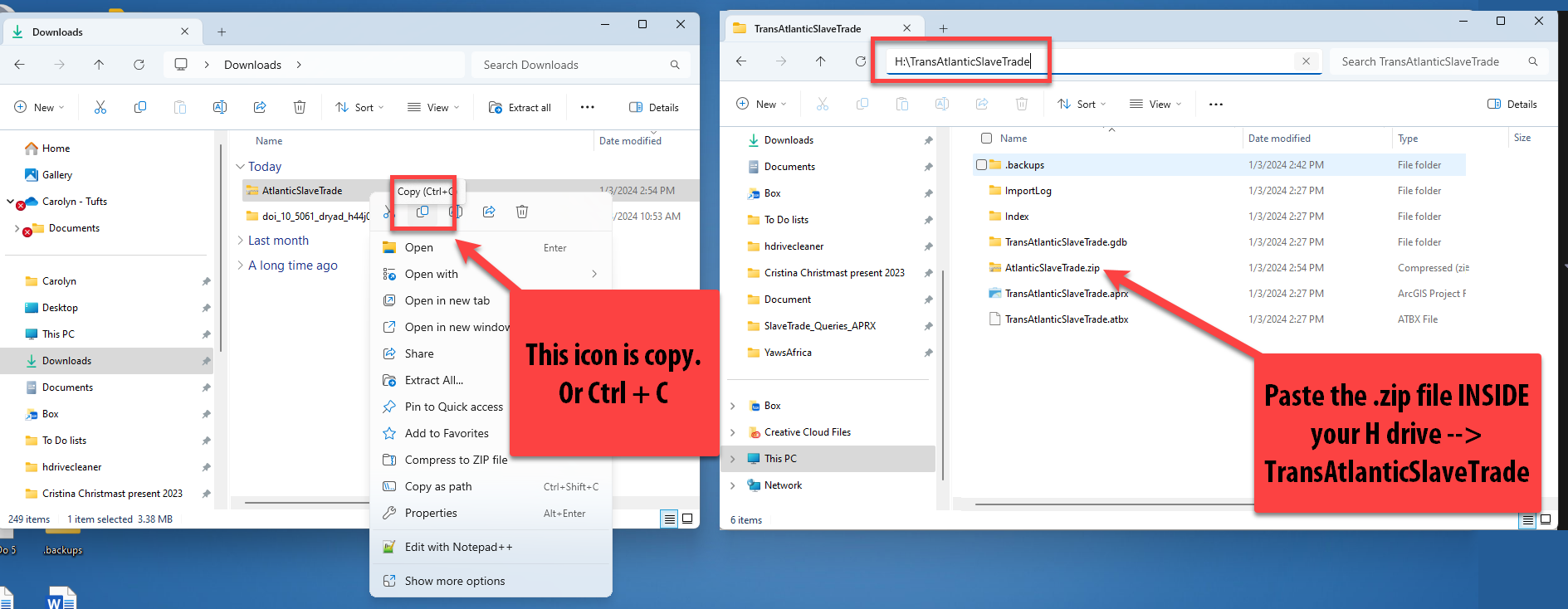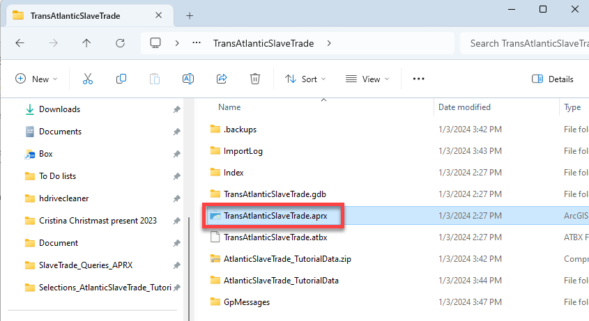 TransAtlanticSlaveTradefolder. Make sure to paste it INSIDE your project folder. This will ensure that the data for the tutorial is WITHIN the ArcGIS Project home folder, making it easier to access in Pro and for better project data management.