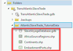 TransAtlanticSlaveTradefolder and then double click on theAtlanticSlaveTrade_TutorialData. You should now see 3 shapefiles with the extension.shpthat will be used for this activity, and one geodatabase *with the extension.gdbcontaining the preprocessed data.