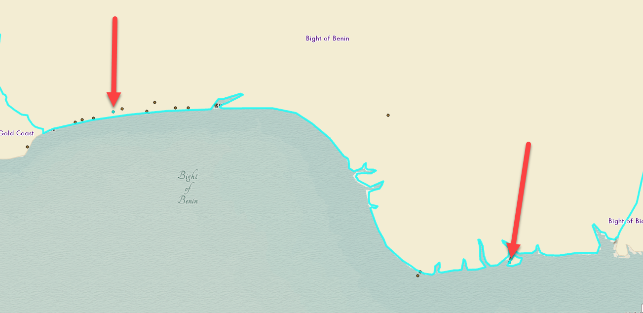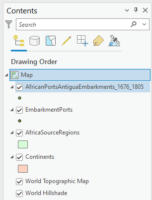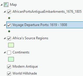 AfricanPortsAntiguaEmbarkments_1676_1805feature class into the map by dragging and dropping the file in the map. The map will zoom to the extent of the data.One by one, drag the other three shapefiles onto the basemap. Take note of what each shapefile looks like when you add it to the map. Are they points, lines or polygons? (The icons in Catalog will give you a hint).