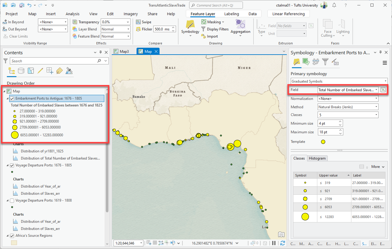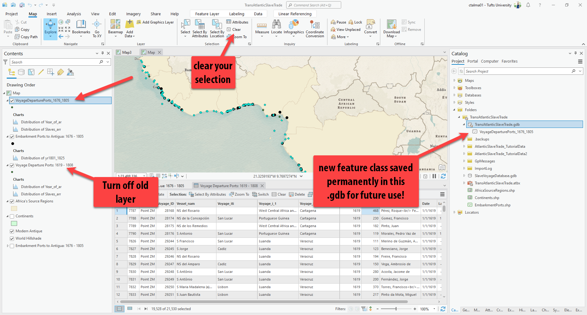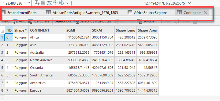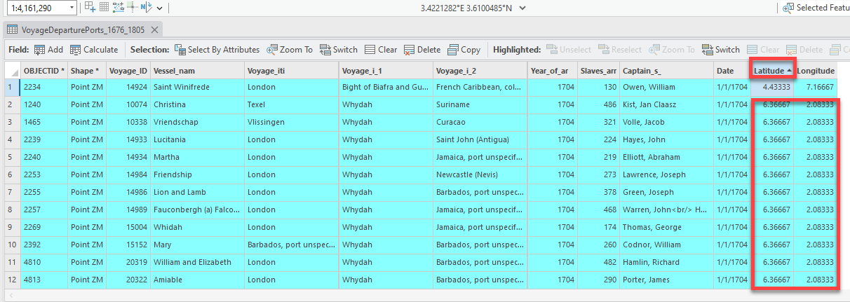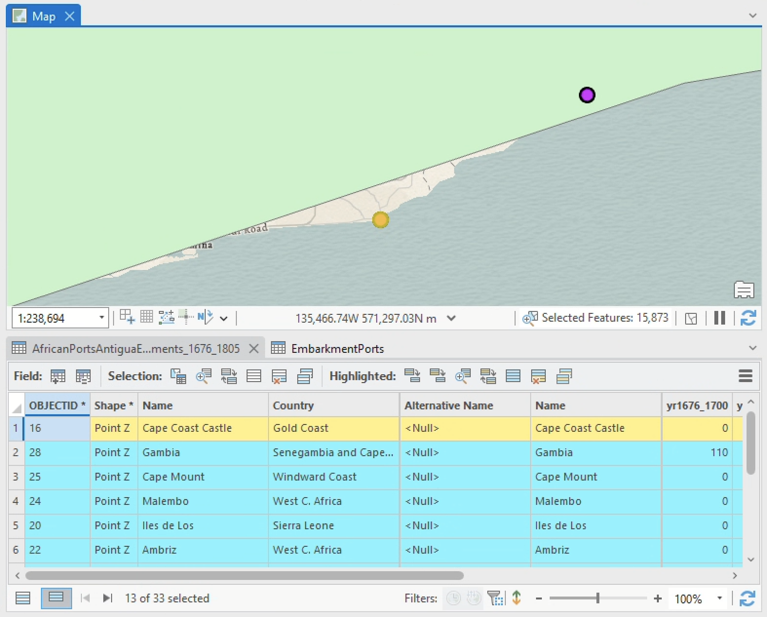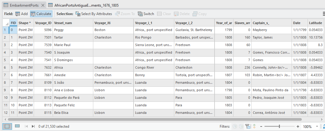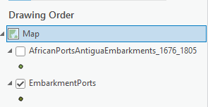 SlaveVoyagesDatabase.gdbto expand it and you will see another file calledAfricanPortsAntiguaEmbarkments_1676_1805. This is a feature class.Pull this