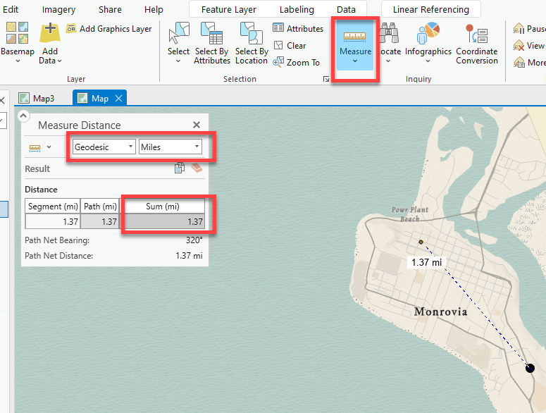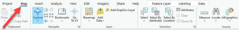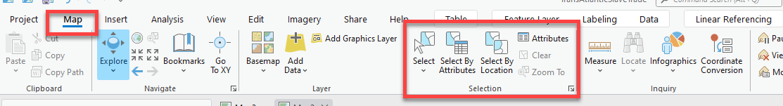In addition to selecting a feature by clicking on in it the attribute table, you can also select a point by clicking on it in the map. On the Map tab, look at the options under selection. There are several options for selecting features in layers.