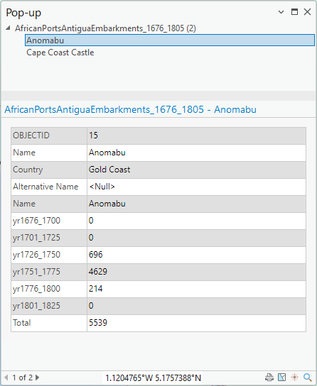 AfricanPortsAntiguaEmbarkments_1676_1805layer. What information do you see in the pop up? What do you think is being mapped based on the layer name and attribute names?