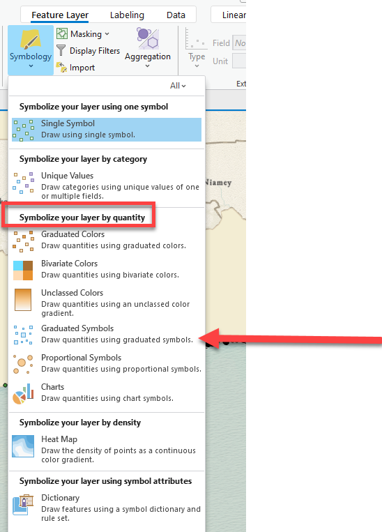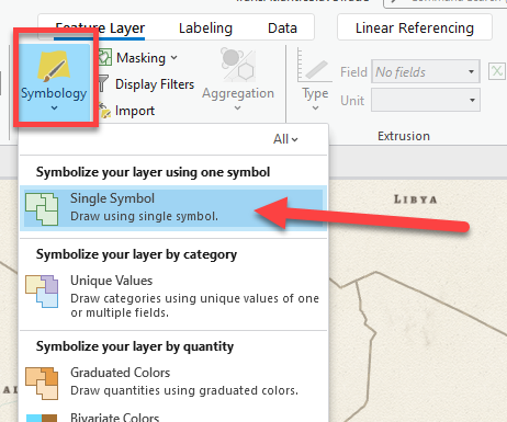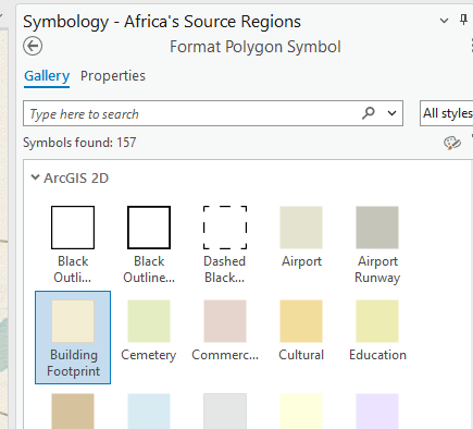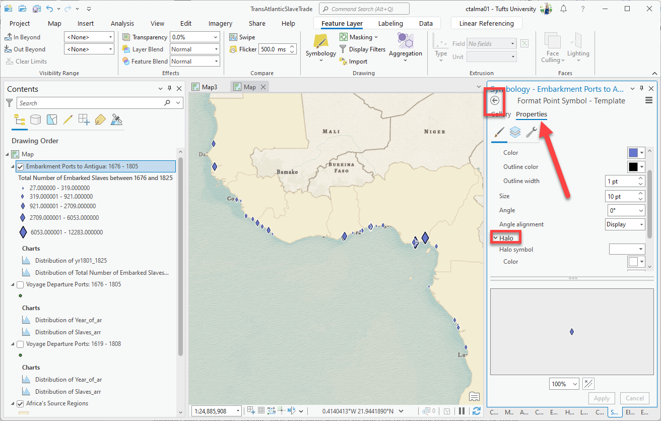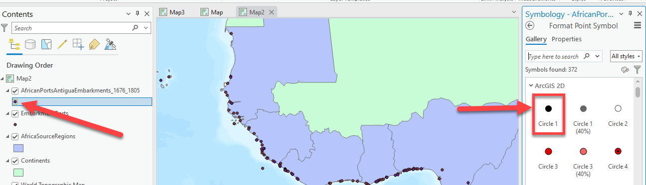 AfricanPortsAntiguaEmbarkments_1676_1805layer. To do this, click on the point underneath the layer name in the Contents Pane. (This is a quick way to open the symbology pane, but you can also right-click on the layer name and click “Symbology.”) Click the large “Circle 1”, for quick and easy distinguishing.