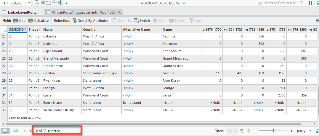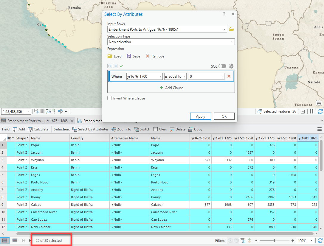 Press OK. You should see that 26 of the 33 ports had 0 embarkments to Antigua between 1676—1700. (You can see the total number selected out of all the rows at the bottom right of the table.)
