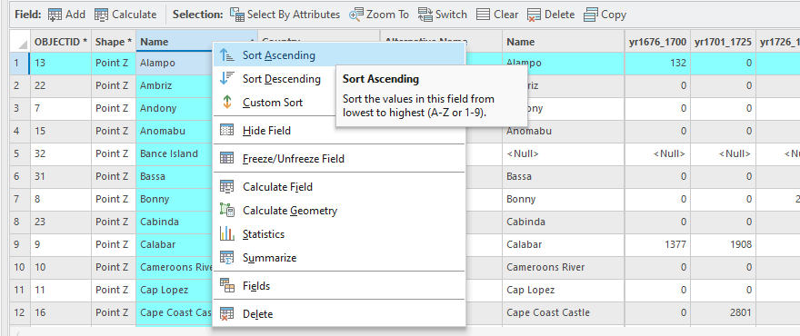 Voyage Pointslayer and make sure theEmbarkment Ports to Antigua: 1676—1805layer is on. Right-click on the layer and open attribute table.Double click on the Name column header. This sorts the names alphabetically from A-Z.