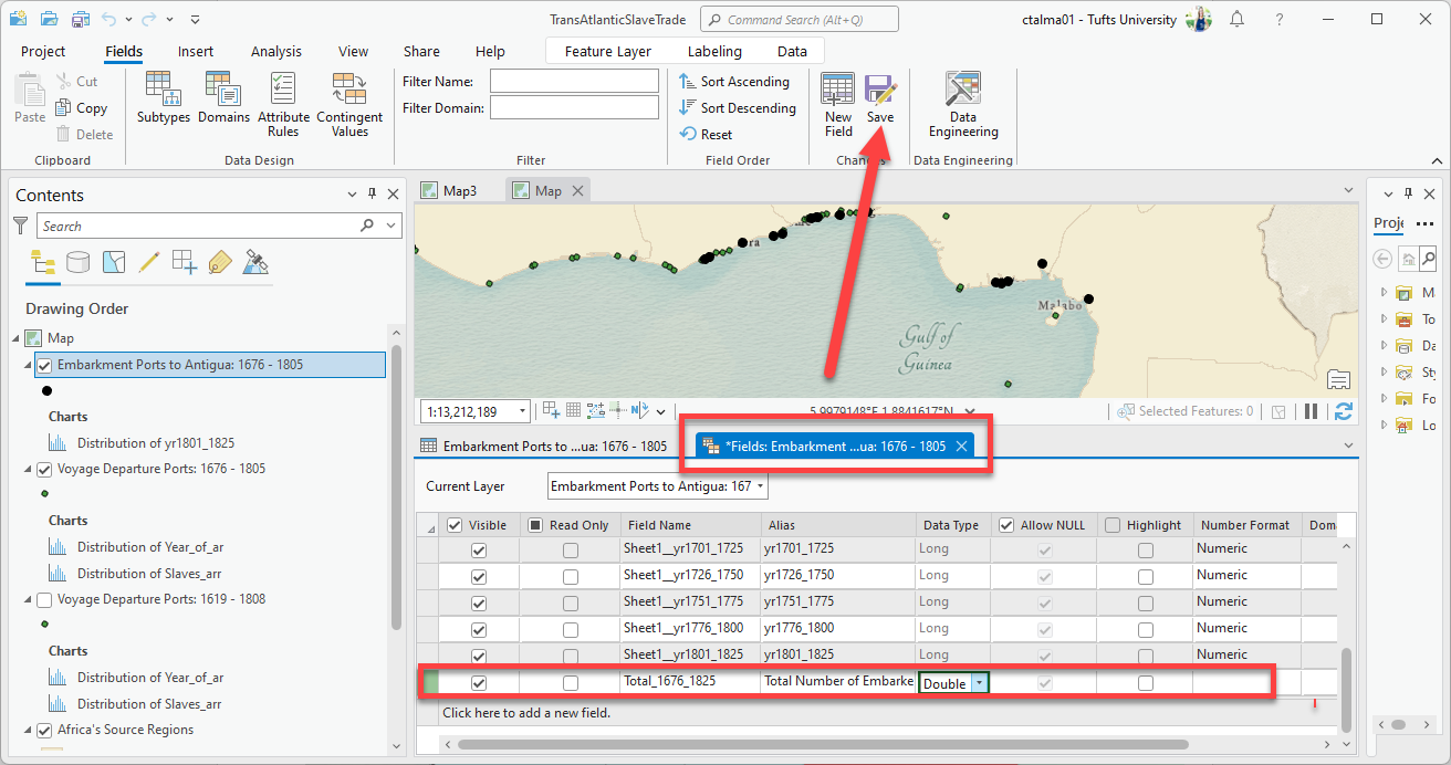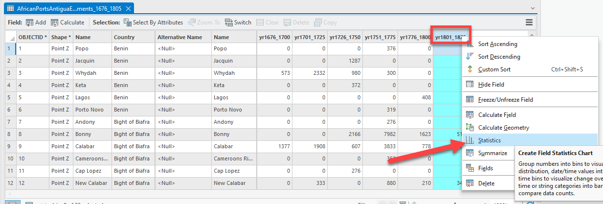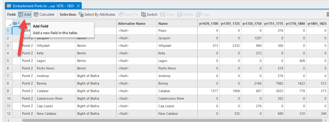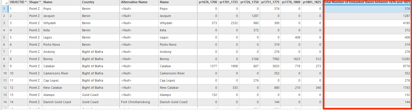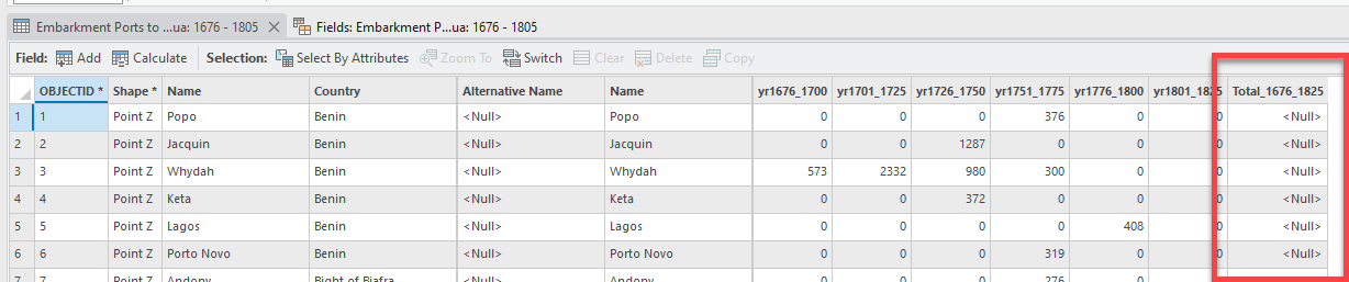 We can also create new fields in an Attribute table and build formulas (just like if we were working in Excel). For example, right now we have the number of embarked slaves in 25-year time increments between 1676 and 1825. We don’t have the total number of embarked slaves from each port over that entire 150 year time span—but we can easily calculate it.