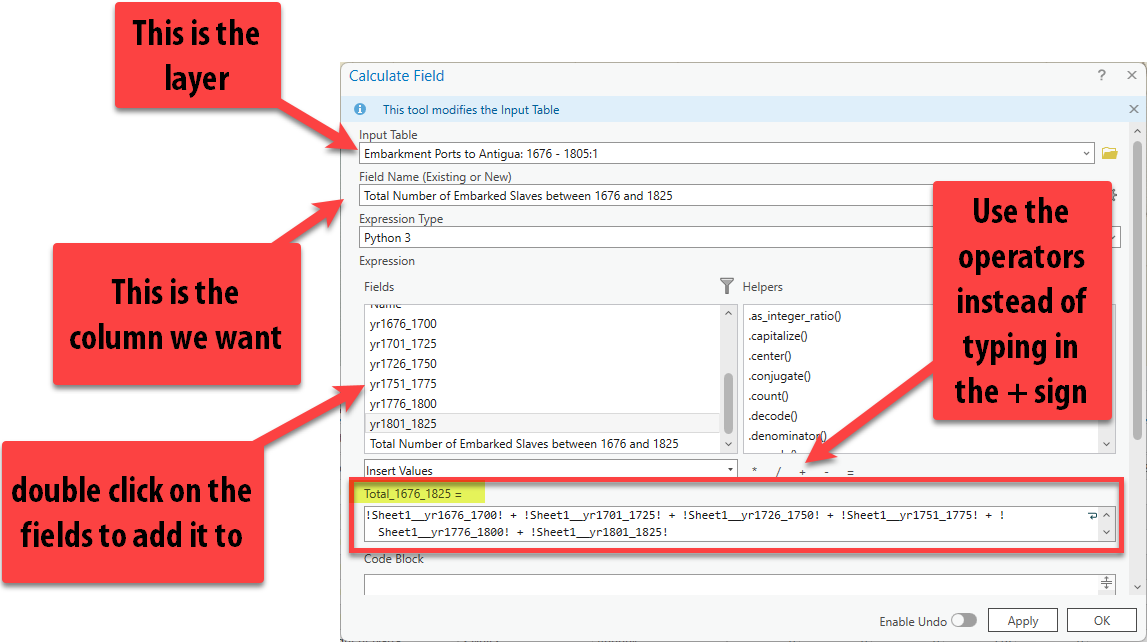 Either right click on the new column and click Calculate Field, or click on “Calculate” at the top left of the table. This will open the Field calculator, which allows us to build a formula for this column. We want to calculate the total number of embarked slaves, which means we need to add all 6 time frames together with simple addition.