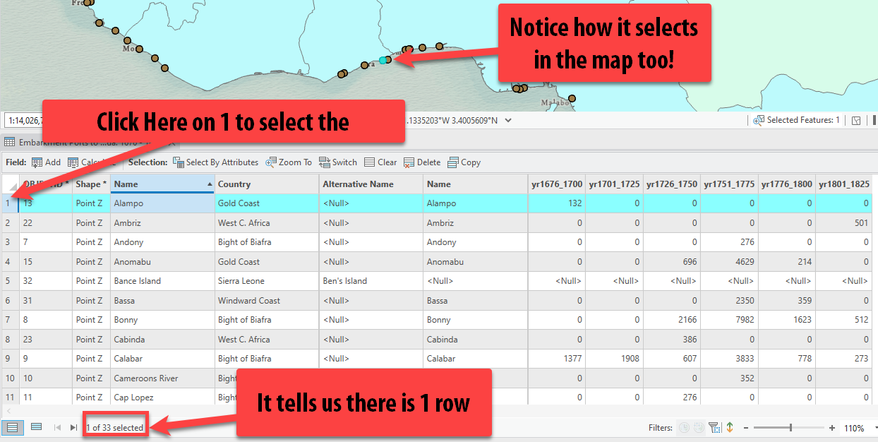 If necessary, click back on the tab for the Embarkment Ports to Antigua attribute table. Now click on the row for Alampo by clicking on the 1 as shown below. You might want to resort by the Name field by double-clicking on it to quickly sort it. Notice how when you click the row in the Attribute Table, it also selects the point in the map, and it shows us at the bottom that 1 out of 33 points are selected. This is called manual selection.