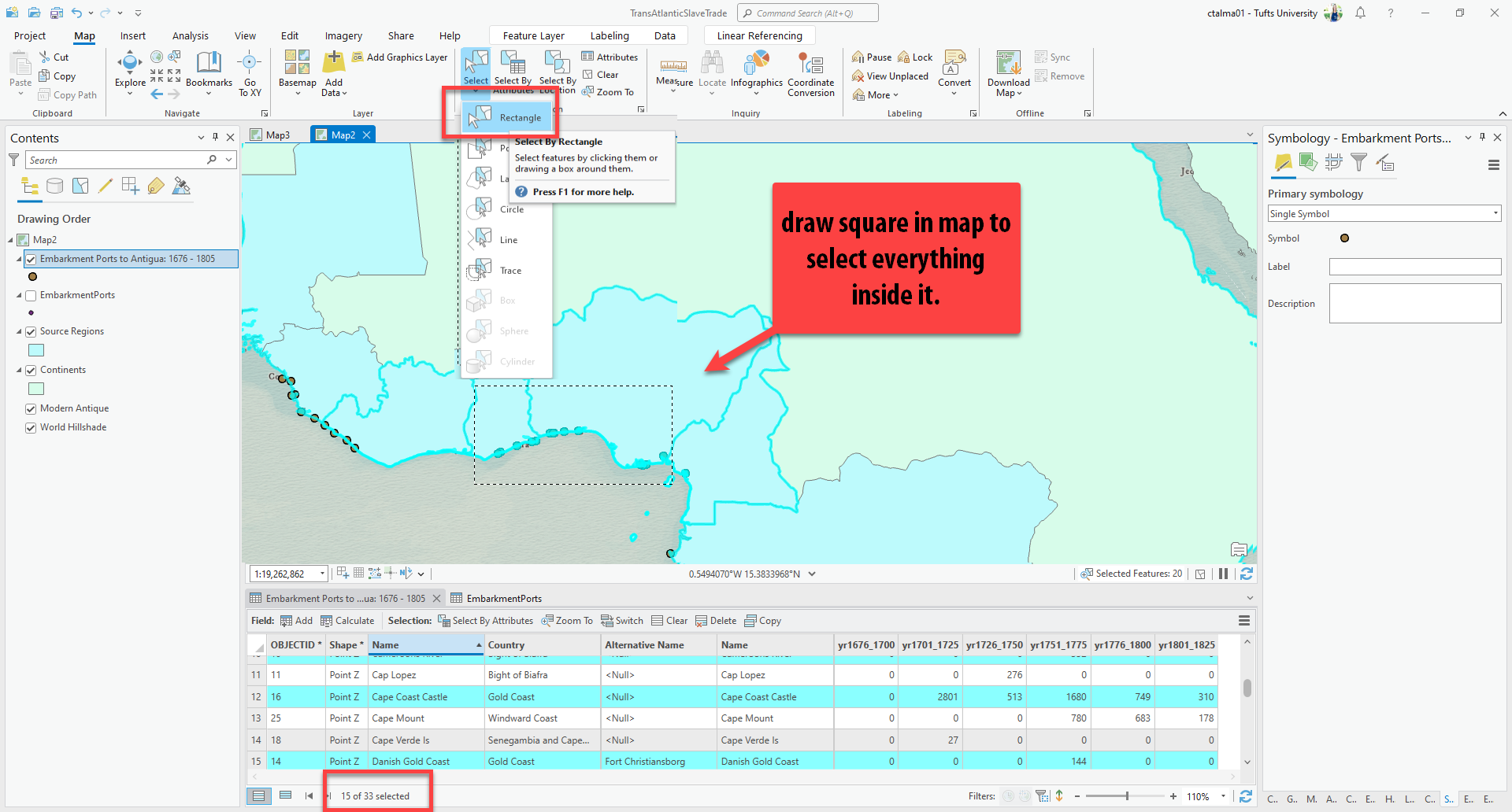 Now under Select at the top, click the drop down and select rectangle. Draw a square in the map and see how all the ports within the square are selected in the map and attribute table. In fact, any layer that intersects your square was selected including the polygons in the source regions layer.