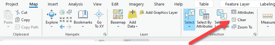 As usual with ArcGIS Pro, there are lots of ways to do a single thing. In this case, you can select features by interacting with the attribute table, or by interacting with the map itself.