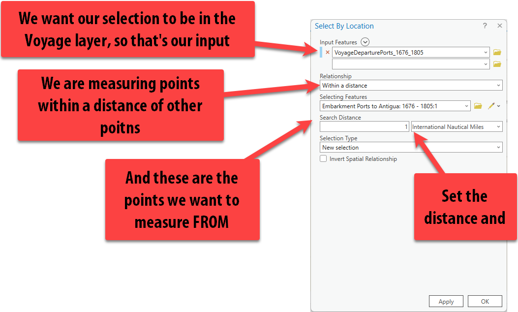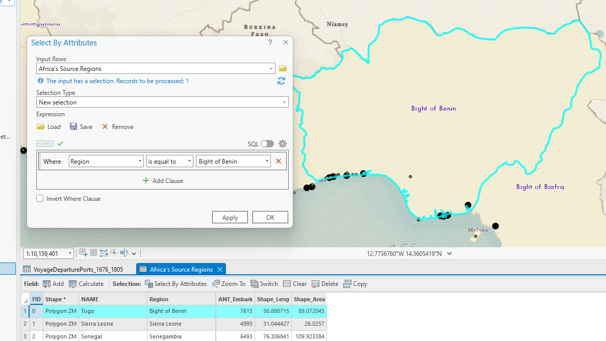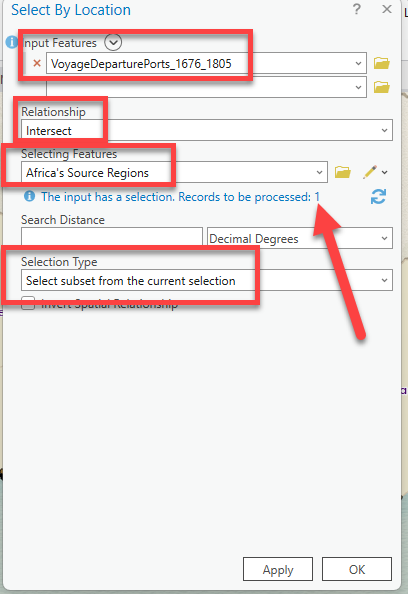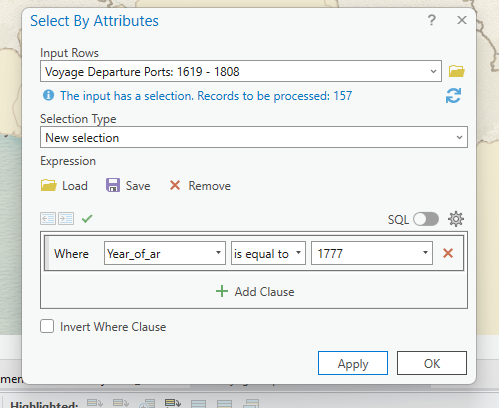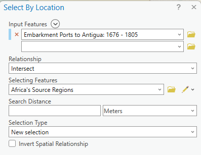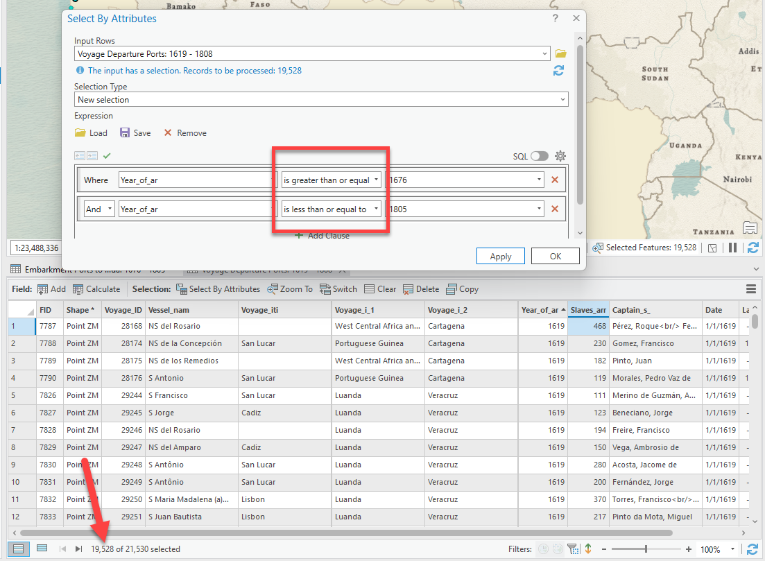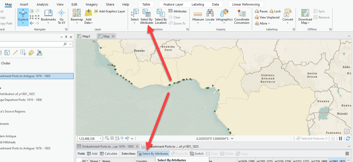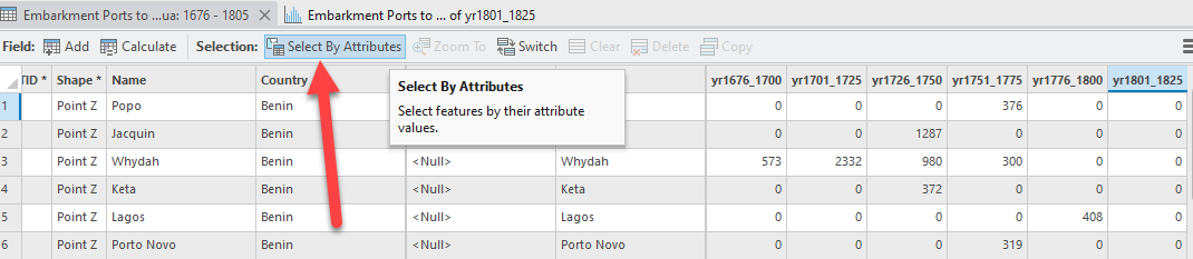 Voyage Departure Ports: 1619—1808. Remember, these points represent the departure port of every transatlantic slave trade voyage made between 1619 and 1808—not just locations to Antigua, but all destinations.Let’s start by building a Select by Attributes expression to select all voyages that arrived in 1777. Click on “Select by Attributes”. Set the expression as follows: