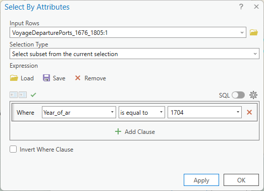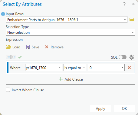 When you open Select by Attributes, a pop-up box appears. Here, we will build an expression that will show us how many ports had no embarkments between 1676 and 1700: