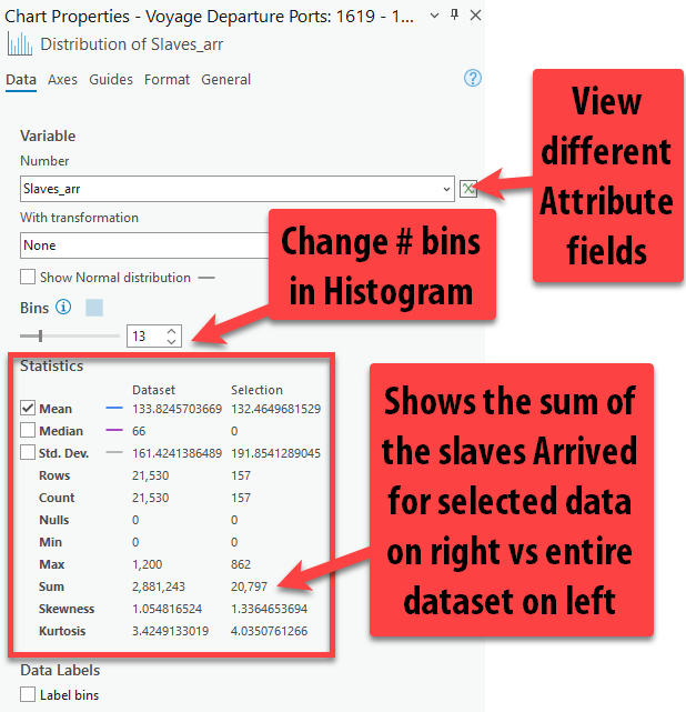 Slaves_Arr(short for Slaves_Arrived) field and click Statistics.Under the Statistics section, the left column has the statistics about the number of enslaved person in the entire dataset (all years) on the left and only the selected voyages on the right. We see that in 1777, there was a total (sum) of 20,797 enslaved person who arrived.