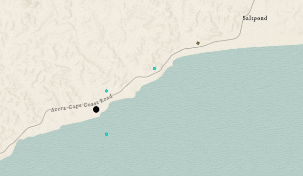 We can derive a lot of information from this map to qualitatively contextualize the quantitative data from SlaveVoyages. For instance, zooming into the top of the map, we can see the names of planters who owned sugar or rum plantations. One is “Royal,” who had a windmill, as indicated by the single dot by the name: