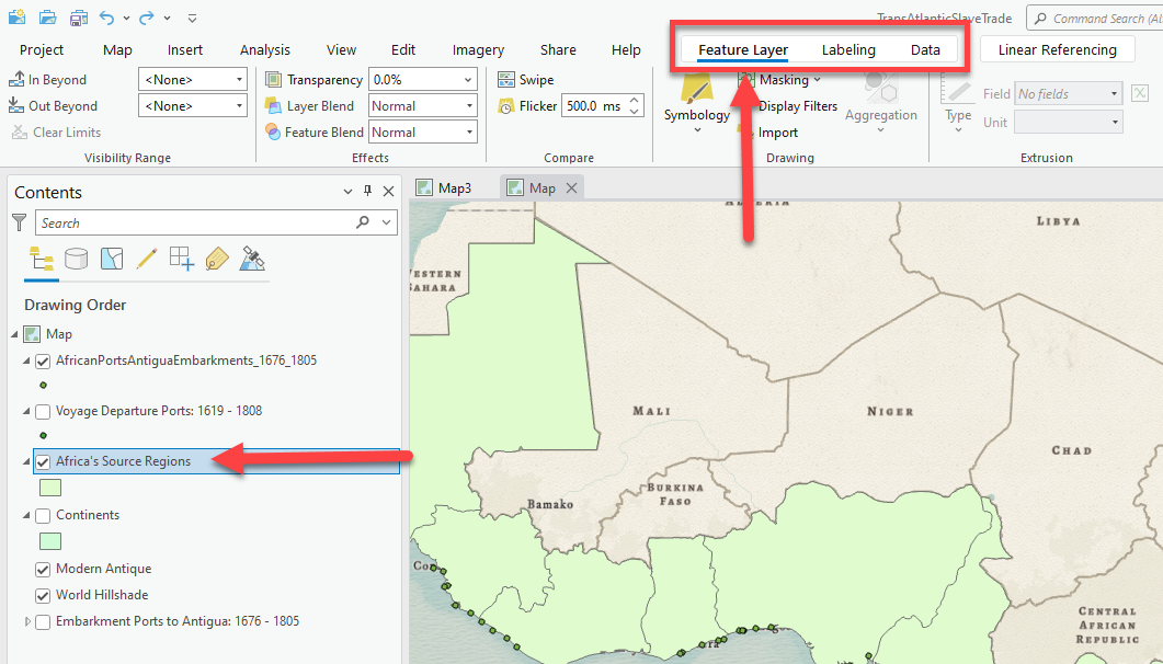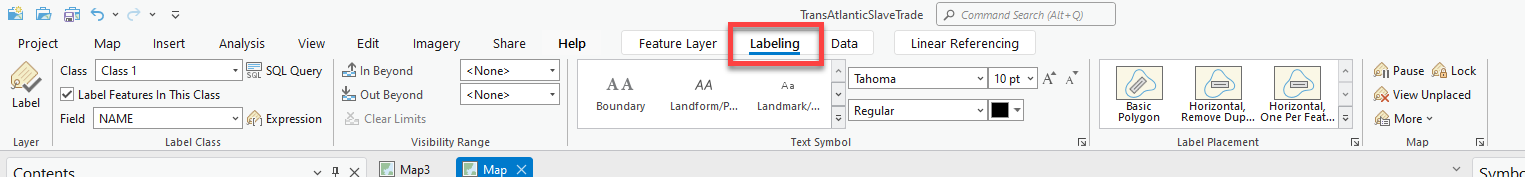 TransAtlanticSlaveTradehome folder, you’ll see a file calledTransAtlanticSlaveTrade.gdb. This is a geodatabase. The data that you’ll use for this lab also comes in geodatabase format. As you saw in Lab 01, any tools that you run will automatically save the new GIS files into the geodatabase. ArcGIS Pro will often encourage you to save other spatial data in it—just note that they’ll be saved as feature classes instead of shapefiles. Esri has written about both geodatabases and features classes if you want to learn more right now.