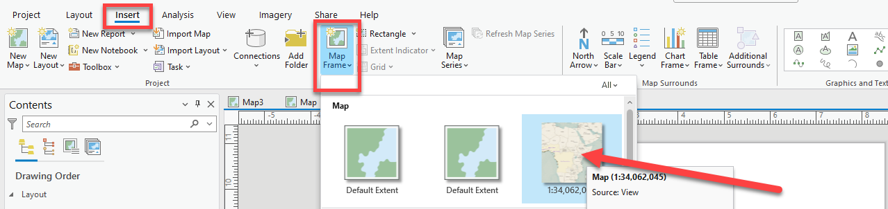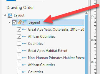 To the left of the screen in the Contents pane, underneath “Drawing Order,” order the layers by dragging them into place. You want the largest polygon layer, the