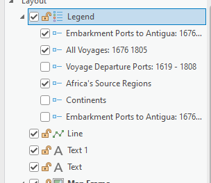 Clear your selection on the Map tab, pull down the new layer under your Embarkment Ports layer, and turn off the original Voyage layer. Rename your new layer to remove any “data speak”, but make sure to keep the dates.