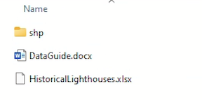 Right now, the spatial data you need is nested within a bunch of other junk folders: HistoricalLighthouses is inside HistoricalLighthouses_UkData, which is inside 854172_HistoricalLighthouses. This is not ideal! If you let these junk folders accumulate, they’ll make it difficult to navigate your workspace down the road.
