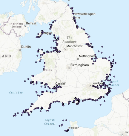 Add the data folder to your workspace and unfold your way to the HistoricalLighthouses.shp file. Add it to the map and you should see a bunch of dots display around the coast of England (feel free to Pin the Catalog pane at this point):