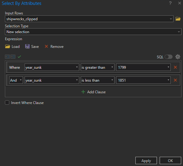 Click the Select by Attributes button at the top of your attribute table and compose a query where year_sunk is greater than 1799 and less than 1851. It should look exactly like this: