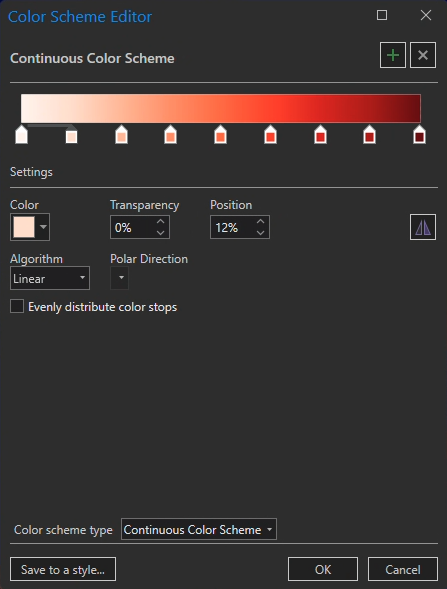 - Color scheme = pick a “Continuous” scheme that starts at white and ends at red (it’s okay if there’s orange in the middle). Also, click on the gear next to the color palette drop-down menu and change the setting to “Apply to fill and outline.”
