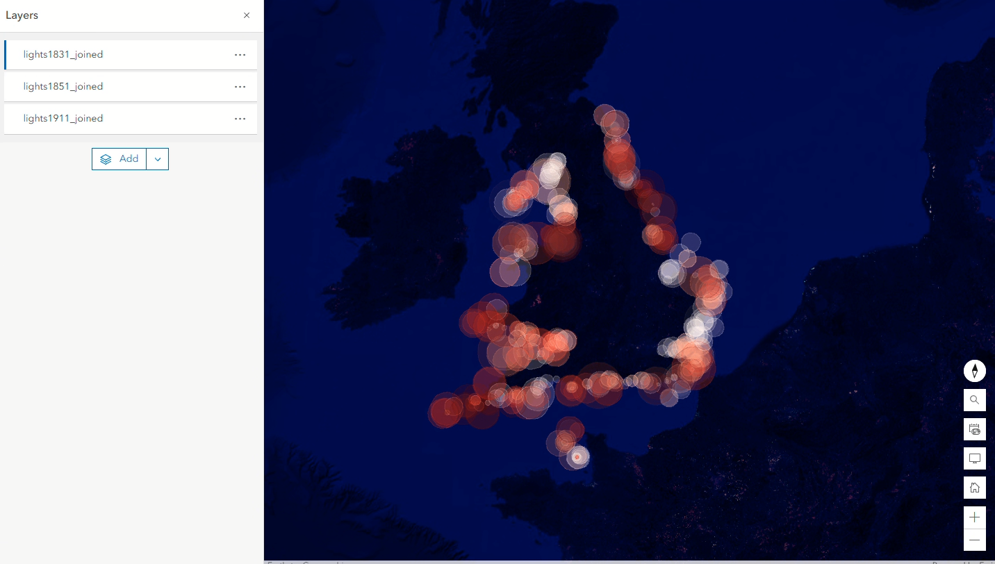 lights1831_joined,lights_1851_joined, andlights1911_joined—and click the Add button beneath them. - Click where it says My content, select Living Atlas, and search for “Imagery.”