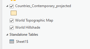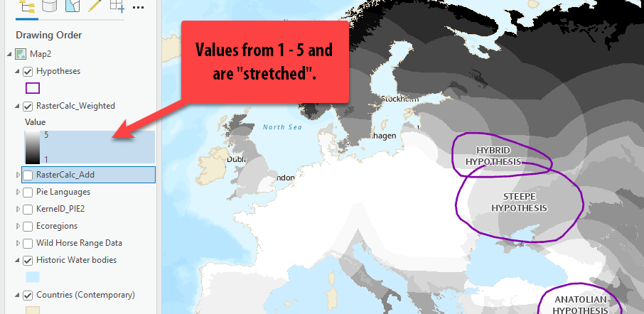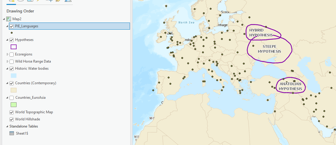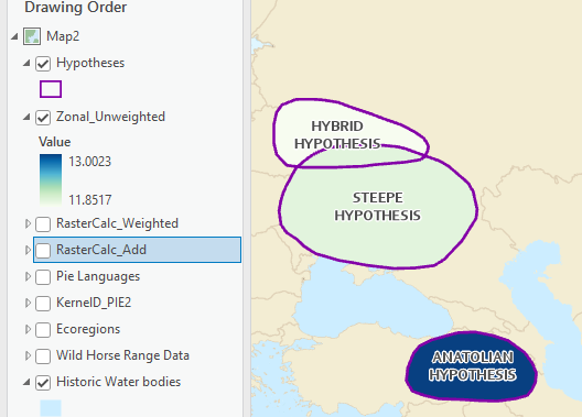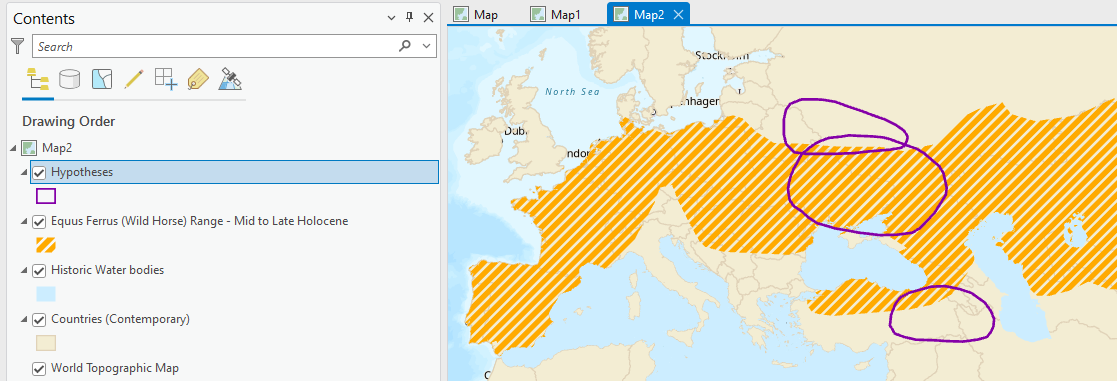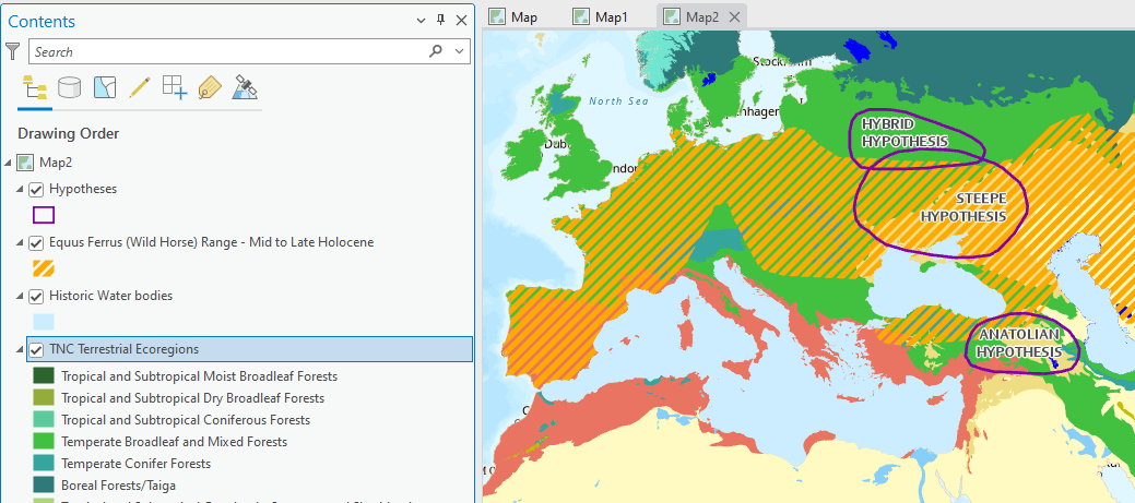Hypothesesis on top, thenEquusFerusRange, then the water bodies, then theCountries_Contemporary_projected, thenCoutries_EuroAsiaat the bottom (and turn it off).Rename the layers so that there is no data speak in the Contents Pane.