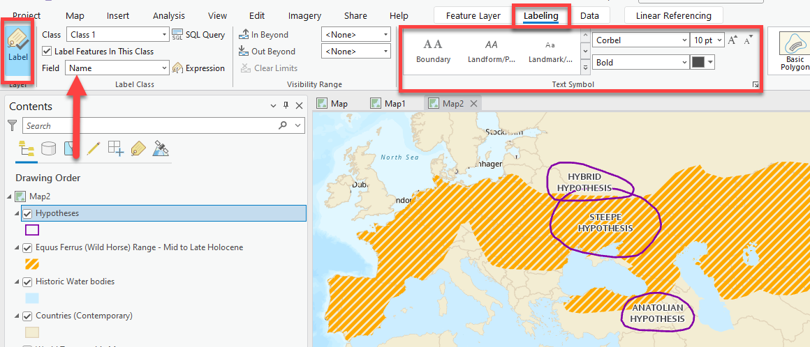 Let’s make it easy to know which hypothesis is which by turning on the labels! While the layer is selected in your Contents pane, click on the Labeling tab and then “Label” all the way no the left to turn them on. Make sure the Field Name is set to the correct field in the attribute table that has info on the hypothesis name! Use the Text Symbol options to style them nicely, perhaps adding a halo.