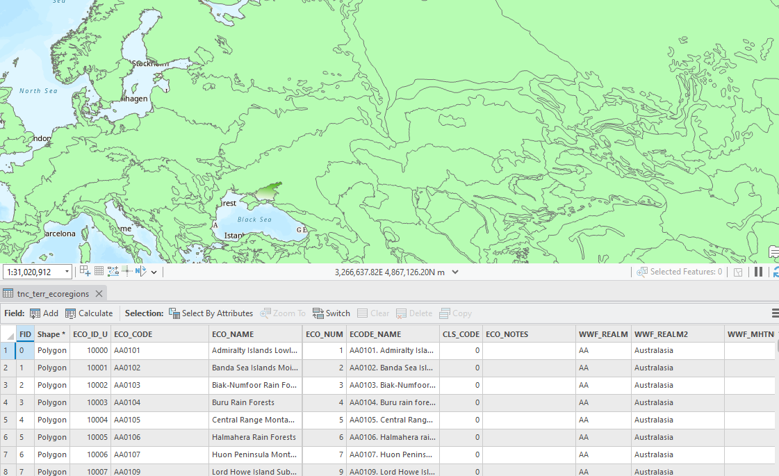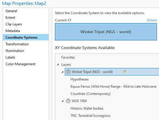 Make sure Winkel Tripel is still selected and set to the “current XY”. Then close the properties. This means our map IS projected and several of our layers, excluding the ecoregions, share the same projection. Yay.