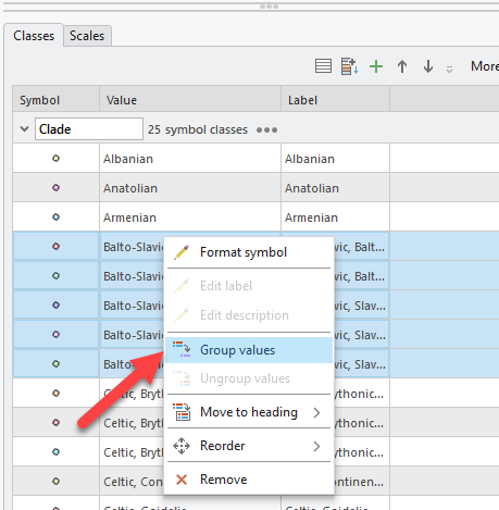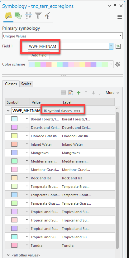 Now the symbology pane will open. Let’s symbolize the data so that it is mapping the WWF_MHTNAM field. There are 16 different symbol classes. While not impossible, we don’t want to waste time picking the perfect color for each.