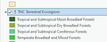 .lyrx) file! A layer file is a pre-symbolized layer with the correct colors already chosen. Go back to Catalog and pull in the layer file called tnc_terr_ecoregions.lyr. You’ll notice a new “layer” is added to your map with excellent colors, but its not showing up and has a little red exclamation point. UGHHH.
