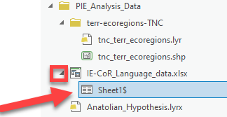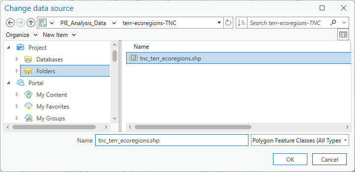 !. Now it wants us to select the shapefile it’s connected to. Navigatge to your project folderPIE_Analysis_Data➡️terr-ecoregions-TNC. Select theTnc_err_ecoregions.shpand press “OK.” Voila! Now the layer works.