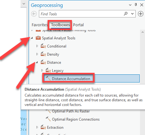 Double-click on “Distance” and find Distance Accumulation. Notice how if you hover over it, it tells you what the tool does!