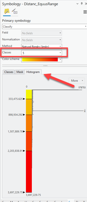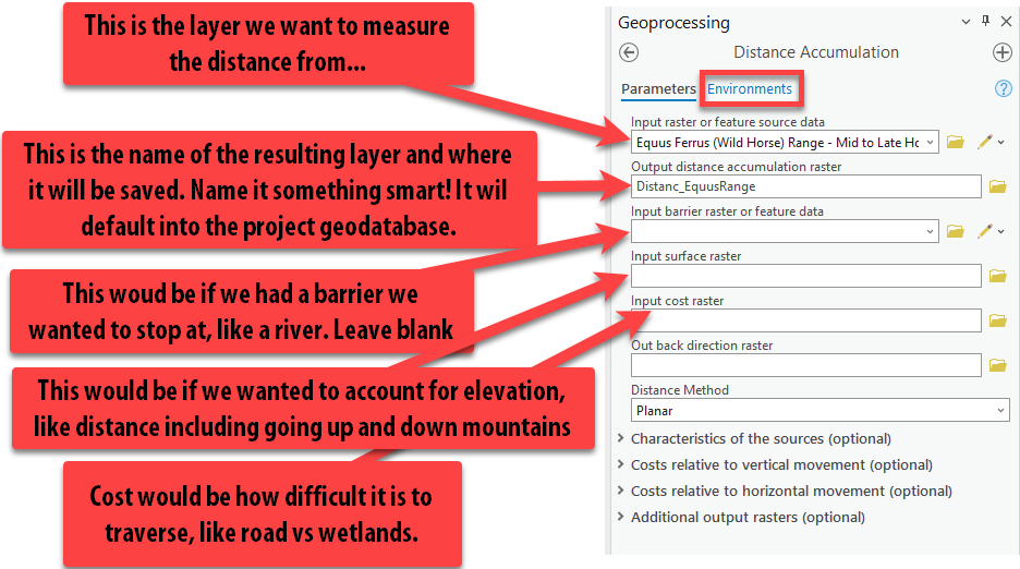 The next thing is to actually calculate the distances from the Wild Horse range outwards. We will use a tool called “Distance Accumulation” to do so. For more info about the Distance Accumulation tool, click here: https://pro.arcgis.com/en/pro-app/latest/tool-reference/spatial-analyst/how-distance-accumulation-works.htm