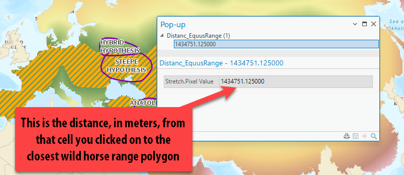 The first analysis factor we will work with will be Distance to the Equus Ferus (Wild Horse) Range. As mentioned in the overview, archeological evidence suggests that the Indo-Europeans were some of the first people in Europe and Asia to domesticate and train horses for long distance travel. Therefore, locations that were within the horse range or close to the horse range are more suitable for their homerange than locations that are far from the wild horse range.