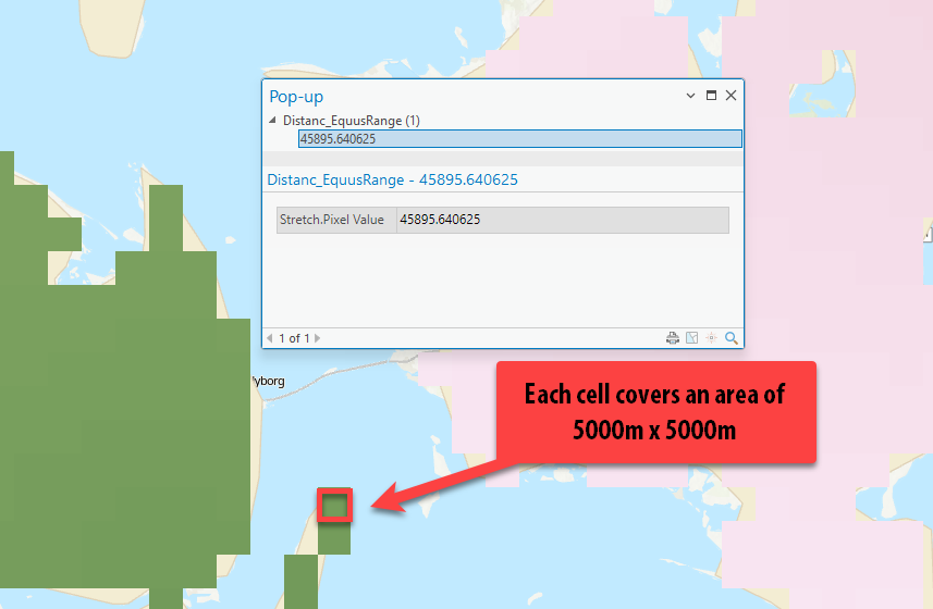 This tool calculates “as the crow flies,” straight line distance from the wild horse range polygon to any given location (in the form of a cell). The results of the Distance Accumulation Tool are a raster grid where any given cell tells you how close—in