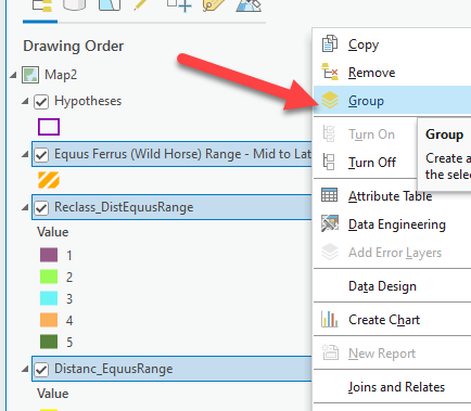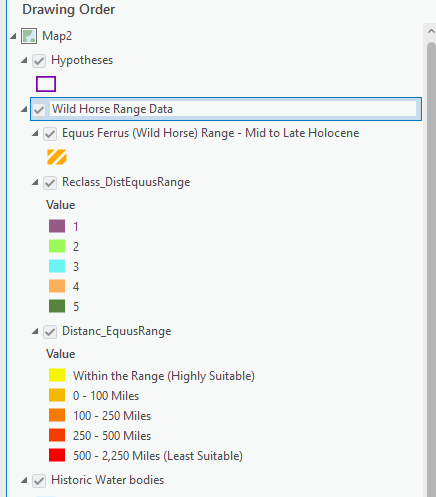 Hypothesesis on top, thenEquusFerusRange, then the water bodies, then theCountries_Contemporary_projected, thenCoutries_EuroAsiaat the bottom (and turn it off). - Rename the layers so that there is no data speak in the Contents Pane.