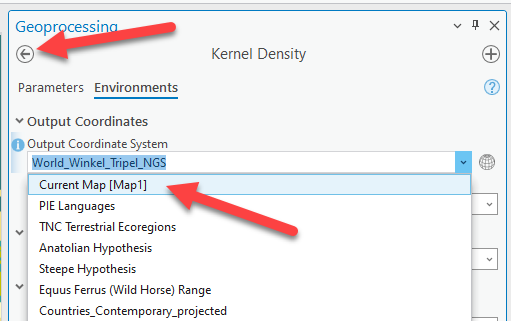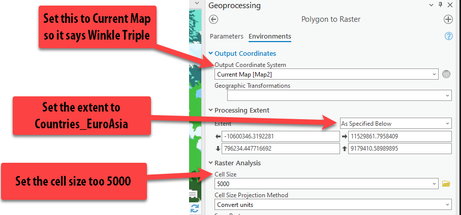 Projection. Choose a projected coordinate system that will ensure the tools run correctly and are in units we understand, like meters. We will use Winkel Tripel, the projection already utilized by our layers, which uses the units of meters.