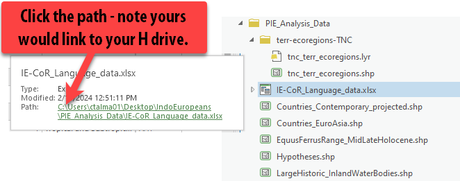 Double click on your home folder and then go into the PIE_Analysis_Data folder. There will be several different types of data for you to work with, including shapefiles and an excel table.