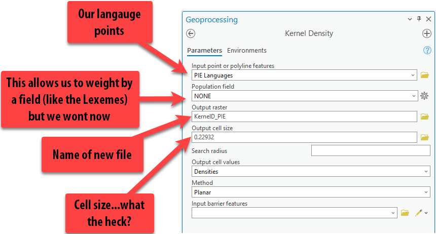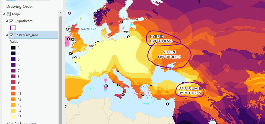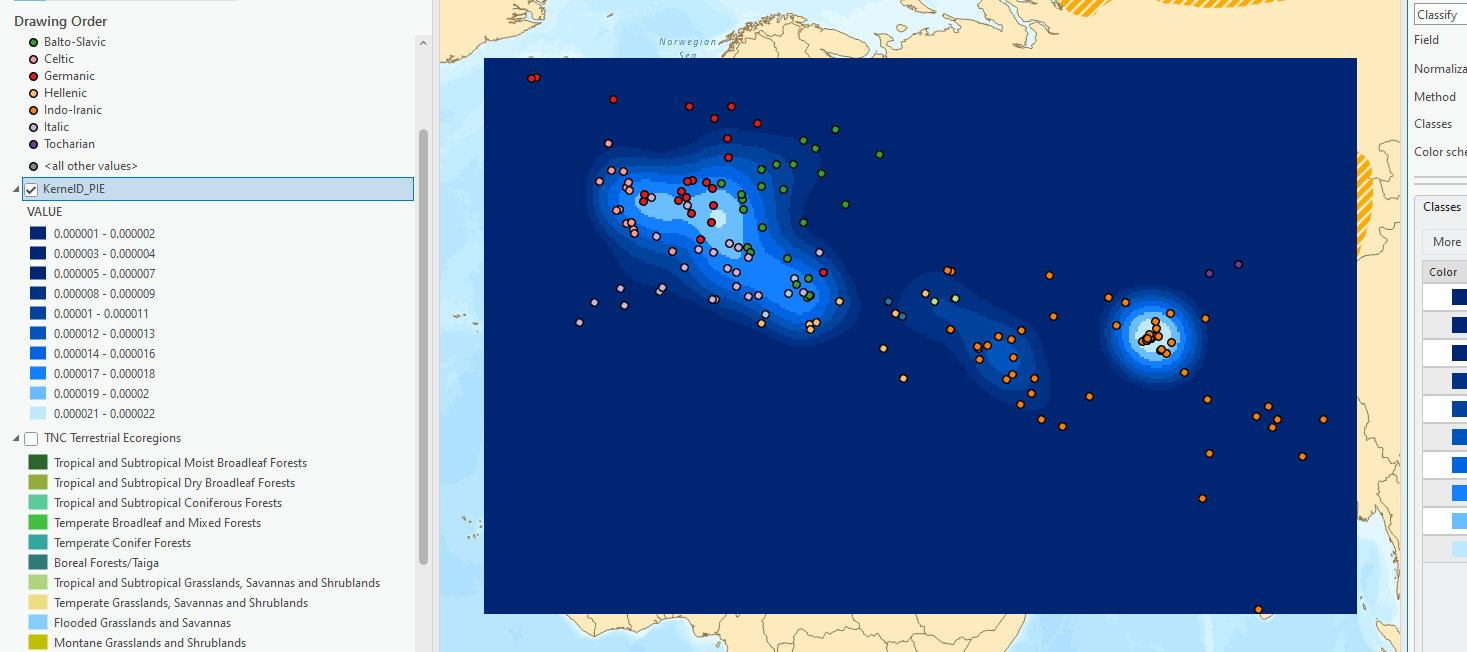 We will import this dataset and then calculate the kernel density of these ancient languages to see where they are highly concentrated. Then we will reclassify the density to score areas of high density as highly suitable for their homeland, and areas of low density to be less suitable for their homeland.