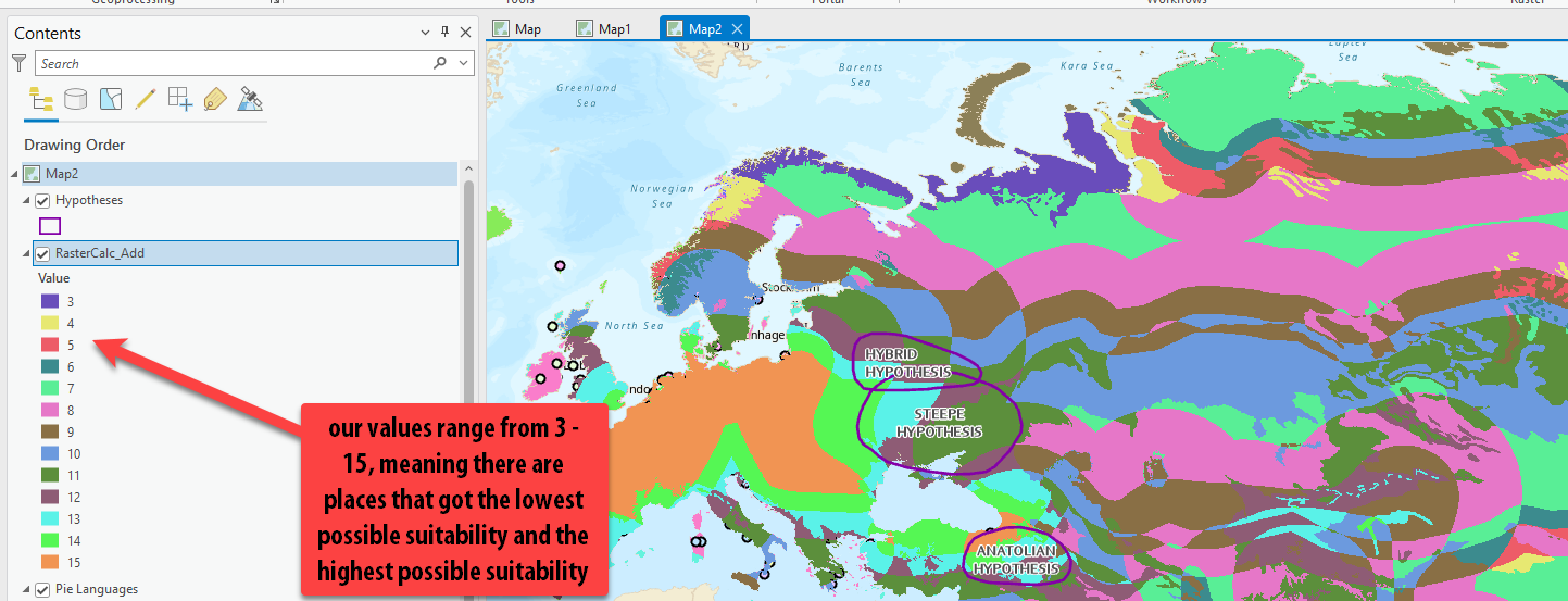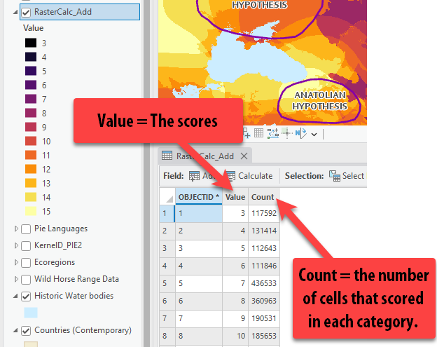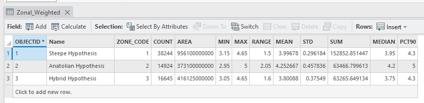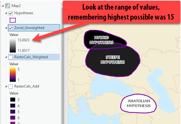 If we look at both our results within the hypothesis polygons, we can see there are lots of cells with a range of scores observed, which makes it hard to understand overall which one is the most likely homeland. However, we can use a tool called Zonal Statistics or Zonal Statistics as Table to get the average suitability score per each hypothesis.
