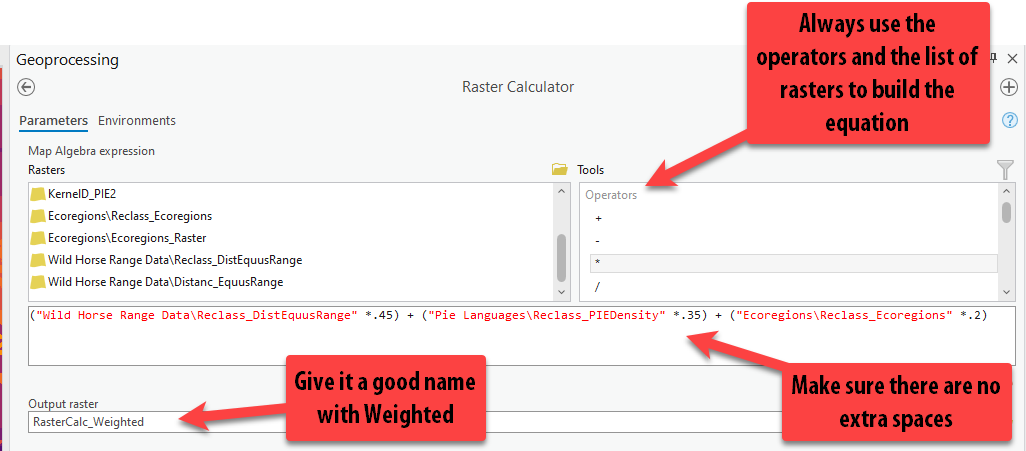 (Wild Horse Reclass * .45) + (PIE Language Reclass * .35) + (Ecology Reclass * .2) = Weighted ResultsOnce again, go to Analysis ➡️ Tools ➡️ Spatial Analyst Tools ➡️ Map Algebra ➡️ Raster Calculator.